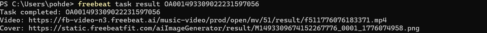 freebeat task wait <task-id> --poll-interval 30s --timeout 3hJSON Output Contract