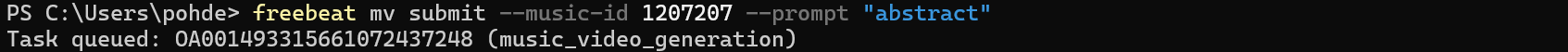 freebeat mv submit --music-id 123 --prompt "neon city, fast cuts"