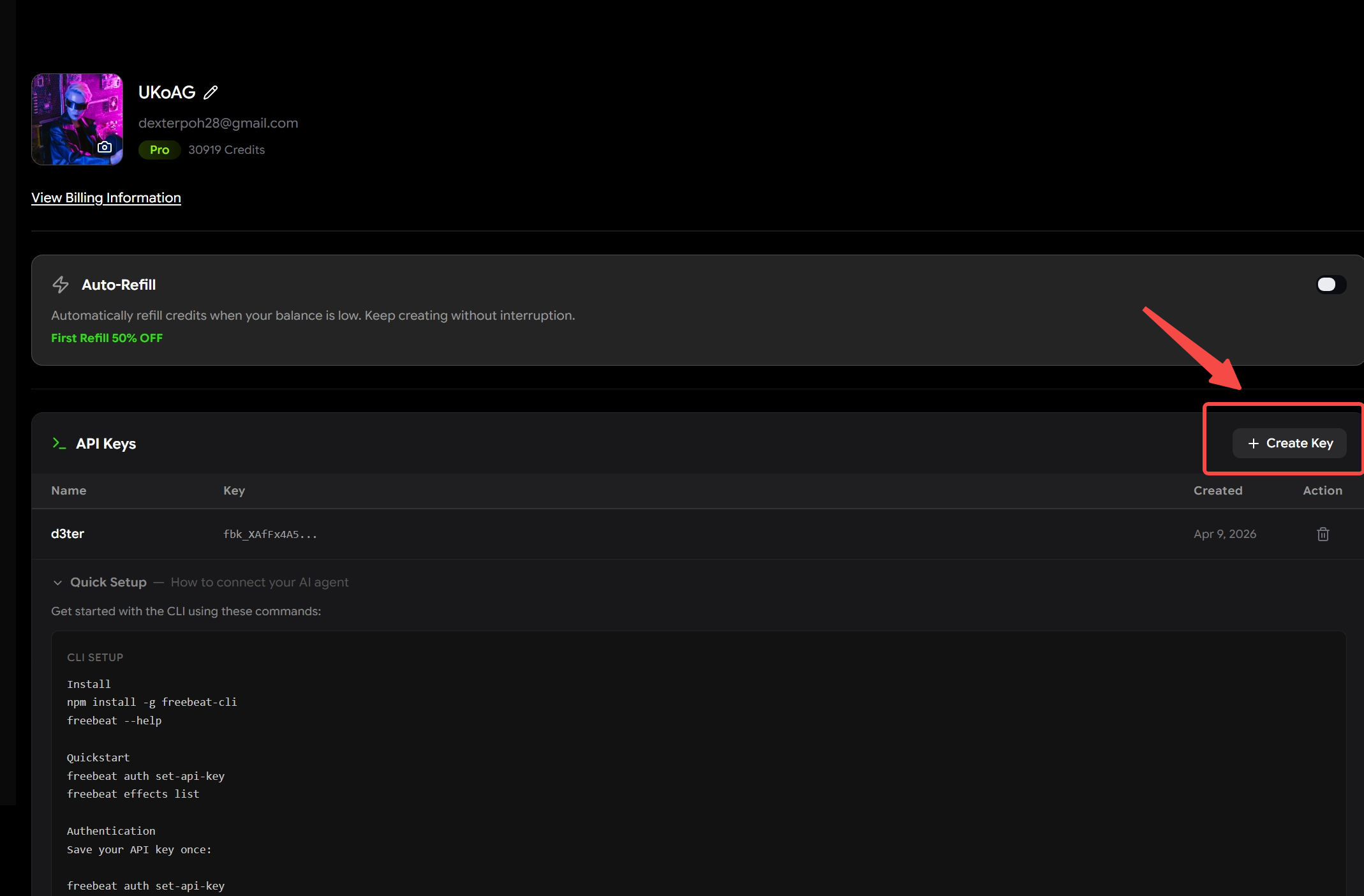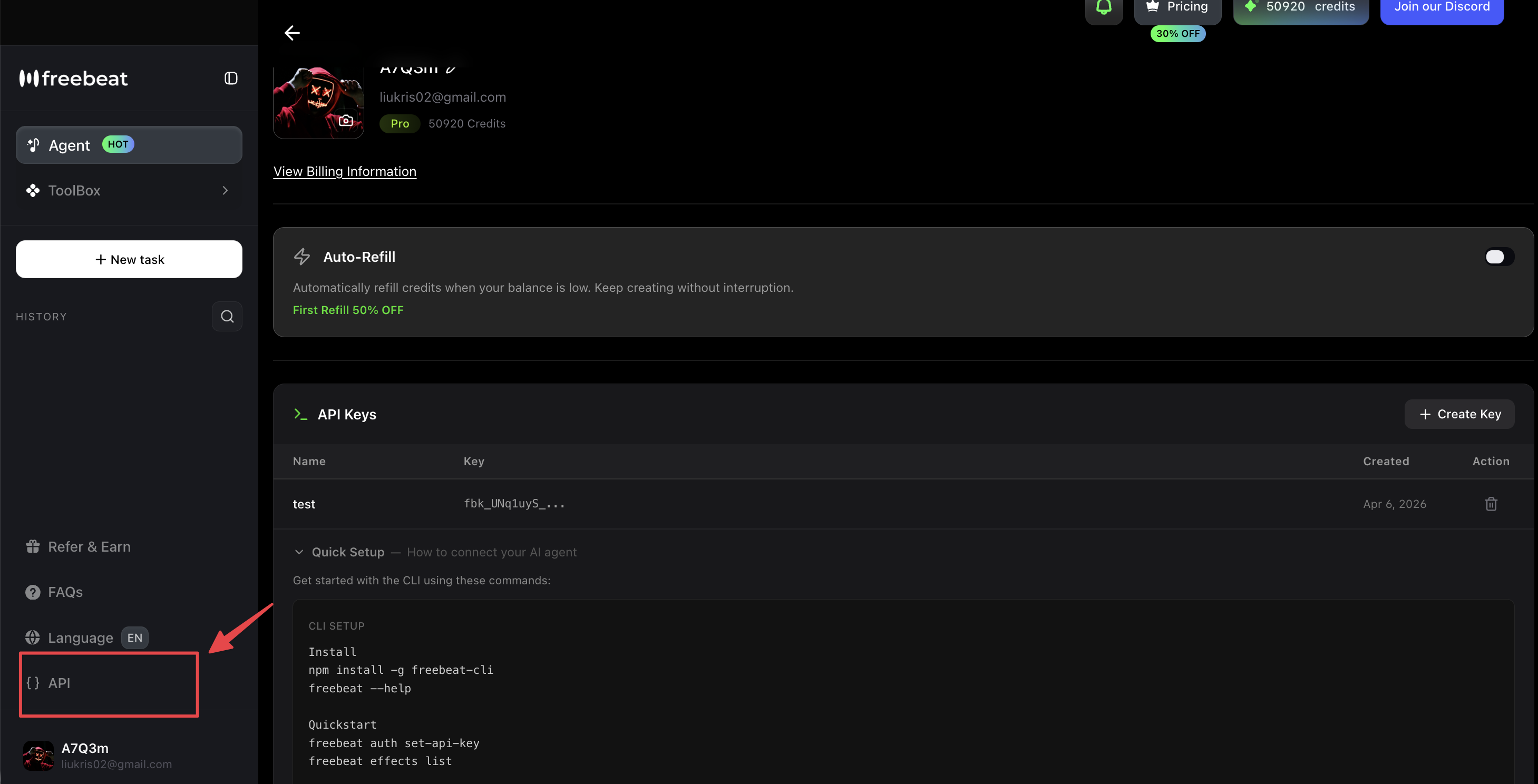 freebeat auth set-api-keyIt should prompt you to input your API Key.